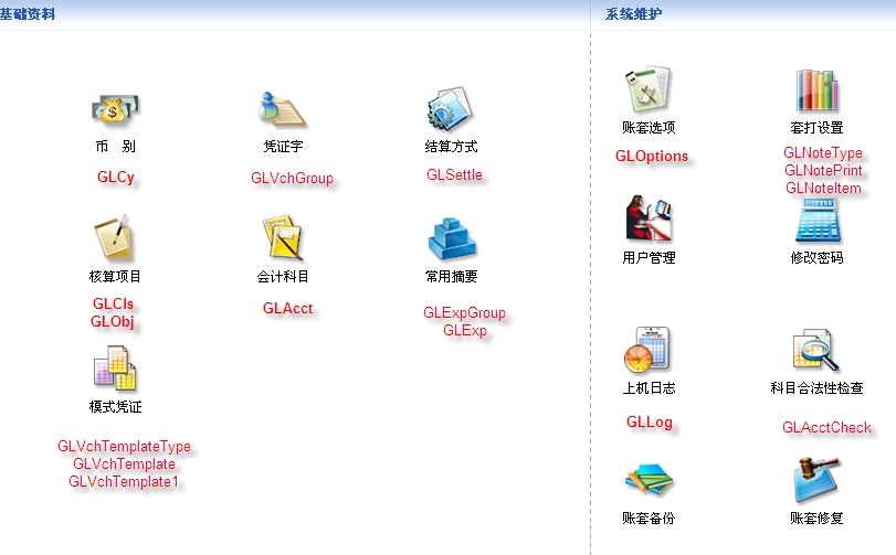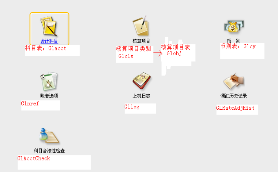 GLObj:核算項(xiàng)目表。 GlPref:賬套參數(shù)表